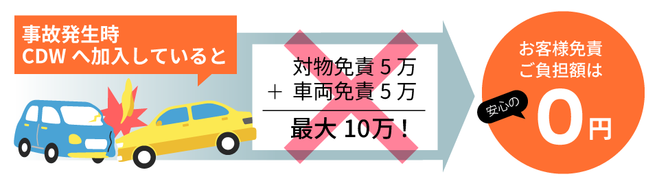 車両・対物事故免責額補償制度(CDW)で万一の事故発生時、お客様ご負担の免責金を補償致します。※保険ではありません。